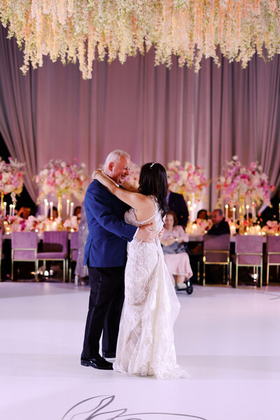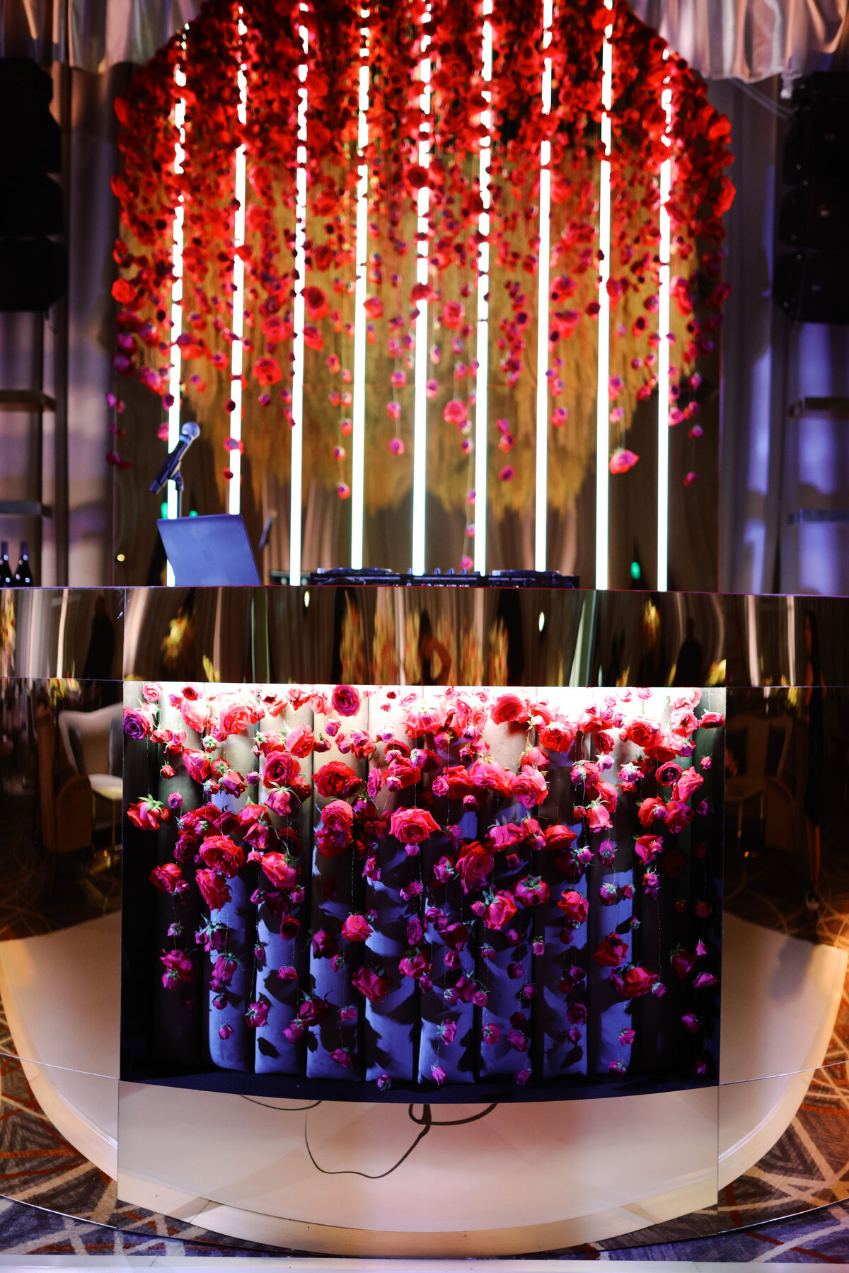 In the reception, a custom gold emblazoned DJ booth flanked by two bars sat at the head of the dance floor, with hot pink roses dripping from the top. Above, a wave of orchids danced from the ceiling to create a 360 degree experience not to be ignored.